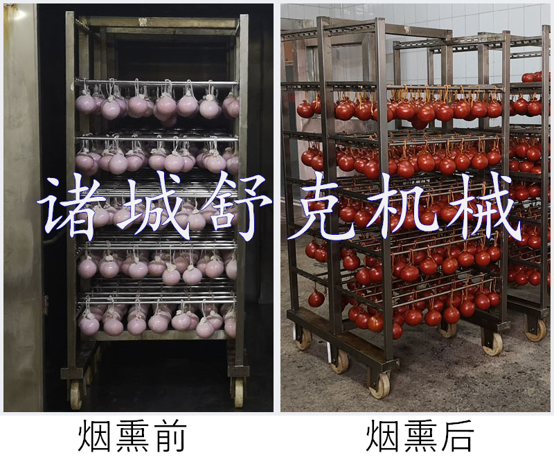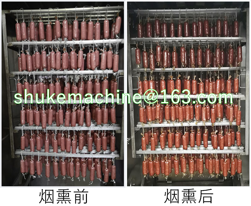 產(chǎn)品通過推車進(jìn)到煙熏爐內(nèi),關(guān)好爐門,通過控制烘干開關(guān),發(fā)煙開關(guān)等.來滿足客戶對產(chǎn)品需求的加工生產(chǎn)。爐門裝置配有高溫雙層玻璃視窗,可看到爐體內(nèi)部產(chǎn)品上色情況等。